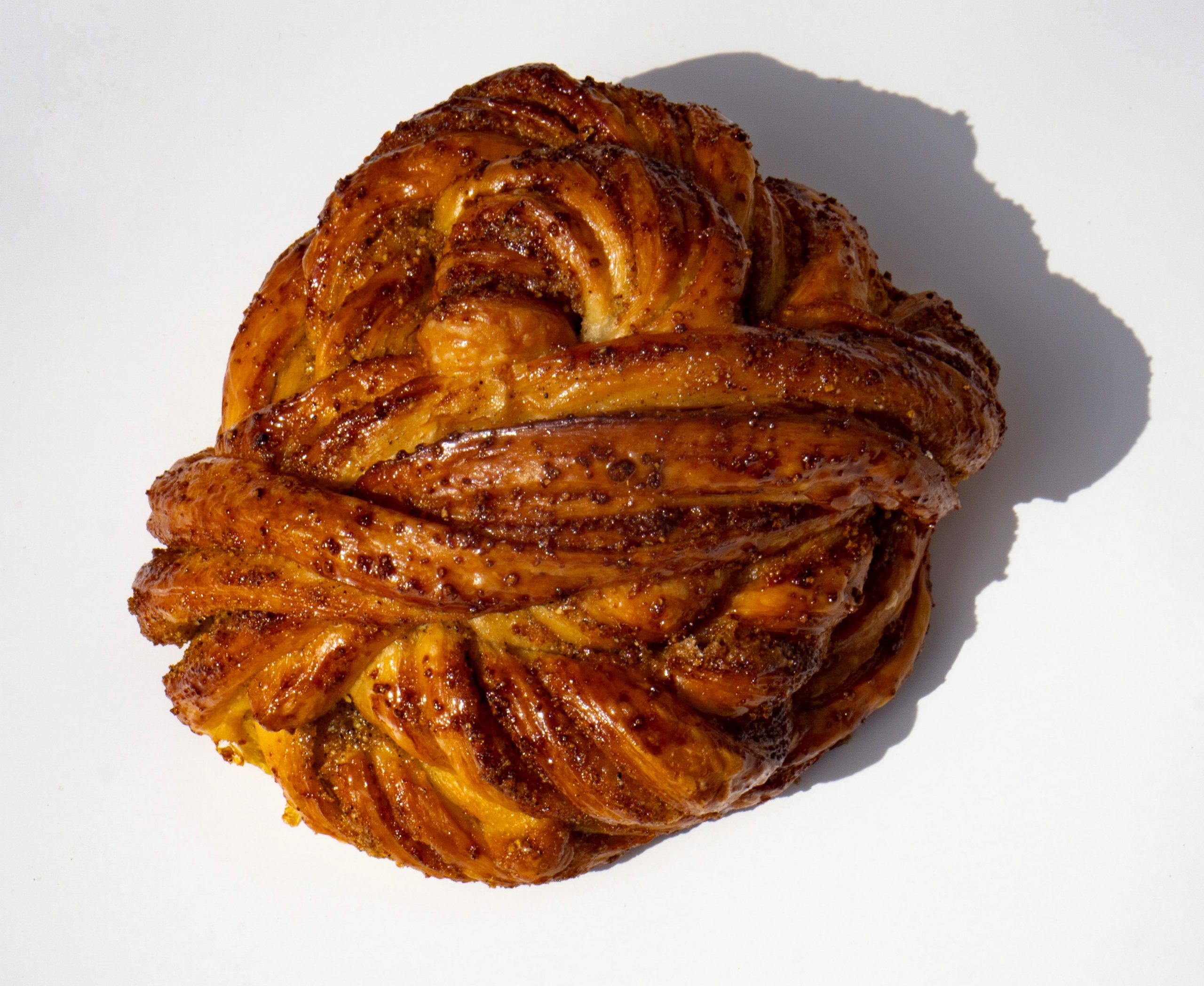 Дважды запеченный круассан, пропитанный коньячным сиропом с кедровым франжипаном, украшенная россыпью кедровых орехов.