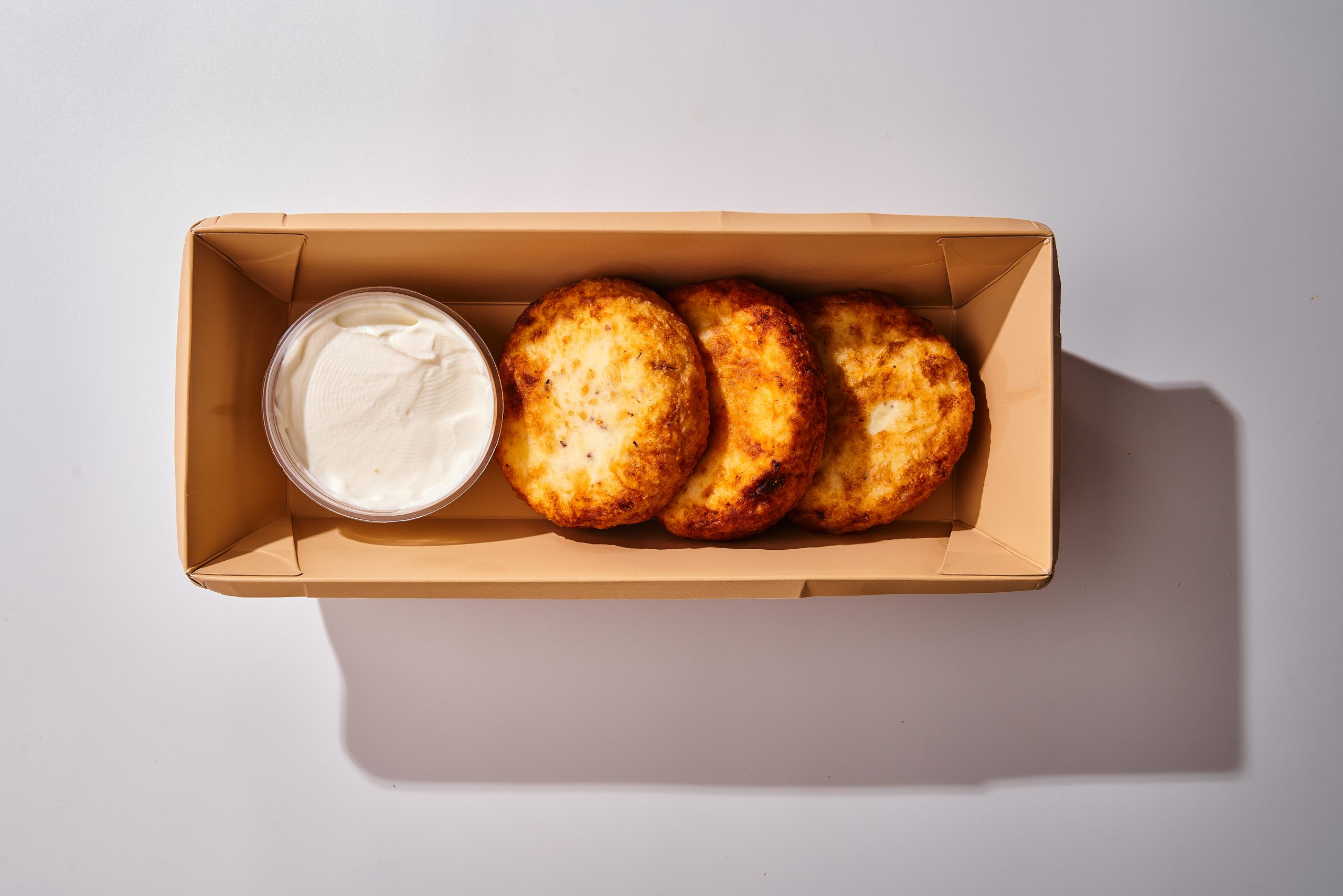 Творог 9%, яйцо, изюм джамбо в роме, вода, сахарный песок, сахарная пудра, мука пшеничная в/с, масло подсолнечное, соусник со сметаной.